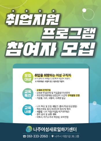 자세한 내용은 나주여성새로일하기센터 유선 및 방문으로 문의하면 된다.