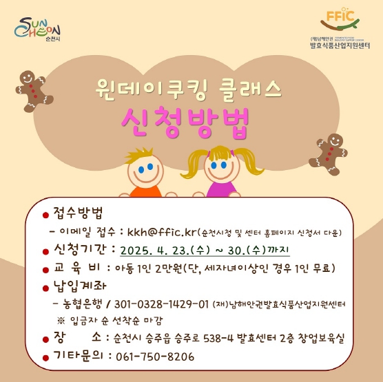 ‘아이랑 함께하는 발효 쿠킹클래스’교육은 오는 30일까지 접수하며, 순천시 누리집 또는 (재)남해안권발효식품산업지원터 누리집에 게재된 공고문에서 신청서를 작성해 이메일로 제출하면 된다. 자세한 정보는 전략기획팀으로 문의하면 된다.