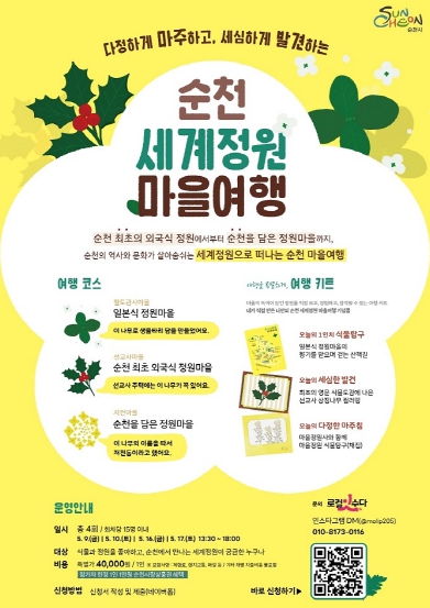 시 관계자는 “3개의 마을에서 순천의 역사와 문화가 담긴 세계정원을 만날 수 있는 상품을 준비했으니, 많은 분들의 관심과 참여 부탁드린다”고 말했다.