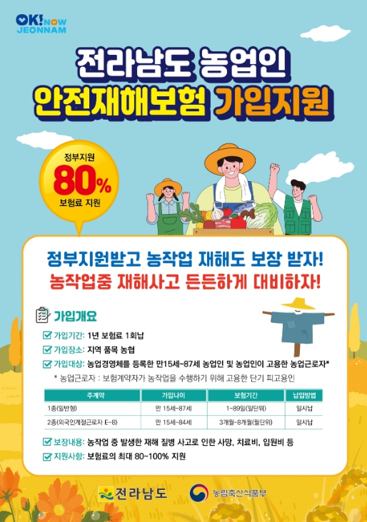 유덕규 전남도 식량원예과장은 “농업 인구의 고령화와 장시간 반복되는 노동으로 농업인이 각종 사고와 질병(농부병)에 노출돼 있다”며 “본격적인 영농철이 다가옴에 따라 예기치 못한 사고에 대비하기 위해 반드시 보험에 가입할 것”을 당부했다.