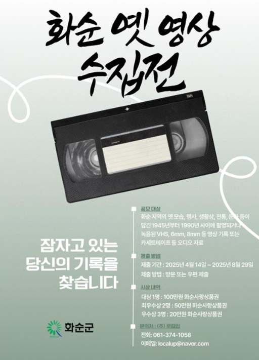 1. 공모 대상 자료 : 화순 지역의 옛 자연, 행사, 군민 생활상, 지역 전통문화 등이 담긴 내용으로 1990년 이전의 동영상 8㎜, 6㎜ 비디오 테이프(VHS)