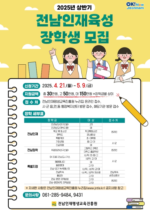 전남인재육성 장학생 선발은 (재)전남인재평생교육진흥원에서 운영하며, 신청 자격은 학생 본인 또는 보호자(부 또는 모)가 공고일 현재 1년 이상 전남도 내에 주소를 둔 초등학생부터 대학생이다.