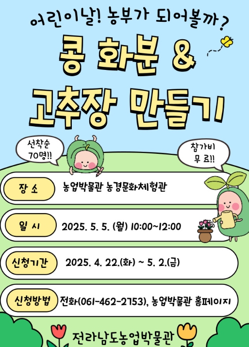 김옥경 전남도농업박물관장은 “아이들이 직접 흙을 만지고, 씨앗을 심고, 전통 식품을 만드는 과정을 통해 전통 식문화와 농업의 소중함을 느끼는 시간이 될 것”이라며 “앞으로도 도민이 즐겁게 참여할 다양한 체험 프로그램을 지속해서 마련하겠다”고 말했다.