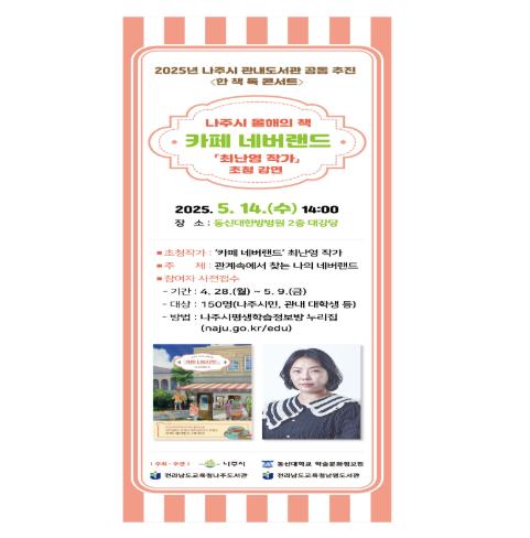 ‘카페 네버랜드’ 한 책 톡 콘서트는 나주시 관내 도서관들이 공동으로 추진하는 행사로, 나주시 시립도서관, 동신대학술정보문화원, 전라남도교육청나주도서관, 남평도서관이 지역민들의 독서 및 문화 진흥을 위해 함께 참여한다.