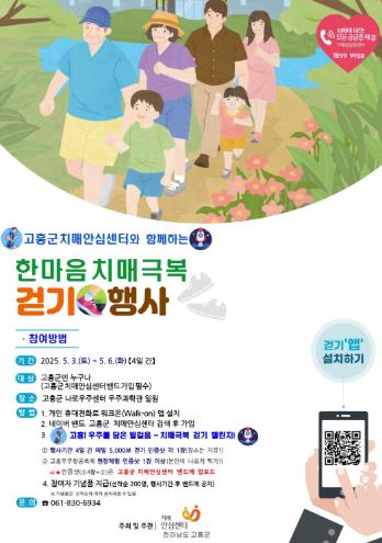 참여 방법은 모바일 앱 ‘워크온(Walk-on)’에 가입한 후, 축제 기간인 4일간 매일 5,000보 이상 걷기를 달성하고, 행사장에서 촬영한 체험 인증사진을 고흥군 치매안심센터 밴드에 업로드하면 된다.
