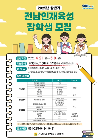 신청 대상은 공고일 현재 학생 본인 또는 보호자(부 또는 모·후견인)가 1년 이상 전남에 주민등록이 돼 있는 초·중·고·대학생이다. 특별격려 장학금은 대학원생도 지원 가능하다.