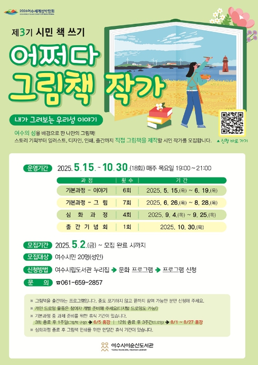 올해 ‘어쩌다 그림책 작가’ 프로그램은 2026여수세계섬박람회를 기념해 여수의 섬을 배경으로 한 그림책 출간을 목표로 하며, 오는 5월 15일부터 10월 30일까지 매주 목요일 18회에 걸쳐 진행된다.