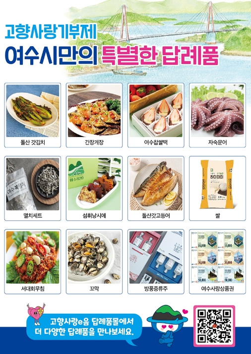 모집 대상은 △관광 서비스 △농·축·수산물 △가공식품 △생활용품 등 4개 분야로, 여수시에 사업장을 둔 개인사업자, 법인, 단체로서 답례품을 직접 생산·배송할 수 있는 업체다.