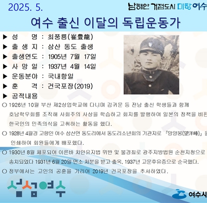 최풍룡 선생은 1905년 7월 17일 태생으로 1926년 10월 부산 제2상업학교에 다니며 김귀문 등 전남 출신 학생들과 함께 호남학우회를 조직, 사회주의 사상을 학습하고 회지를 발행해 일본의 정책을 비판하는 등 한국인의 민족의식을 고취하는 활동을 했다.