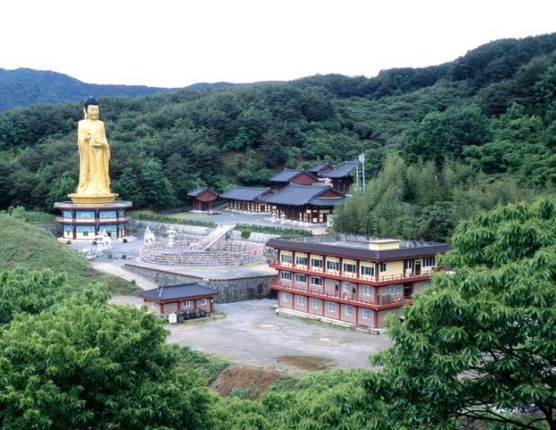 절 마당에는 40m에 달하는 황동약사여래입상이 푸른 하늘을 배경으로 웅장하게 서서 신비한 아우라를 자아낸다.
