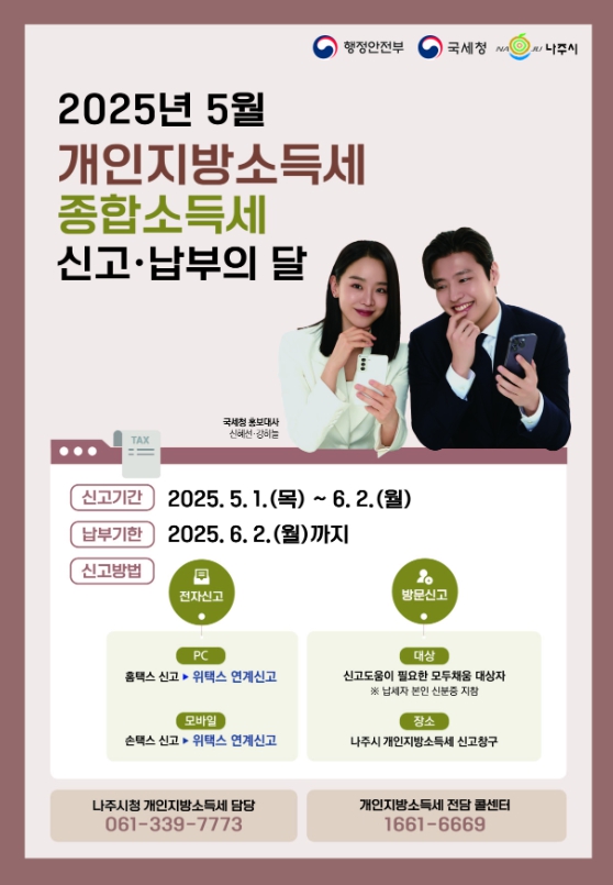 김경숙 나주시 세무과장은 “신고 마감일인 6월 2일에는 홈택스, 위택스 연계가 불안정할 수 있으니 사전에 신고·납부하시기 바란다”며 “신고 기간 경과로 가산세 등 불이익이 없도록 기간 내에 신고·납부해 달라”고 말했다.