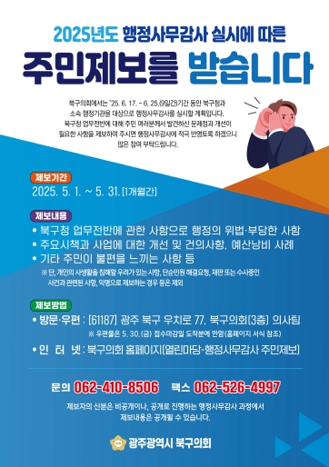 제보는 북구의회 홈페이지, 방문‧우편(북구 우치로 77, 3층 의회사무국), 팩스(062-526-4997) 등 다양한 방법을 통해 할 수 있으며 제보자의 신분은 철저히 보장된다.