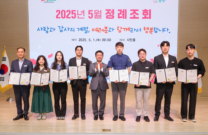 이날 정례조회에서는 전라남도 현장행정 우수 읍면동 ‘대상’에 선정된 광양읍에 대한 기관 표창과 시정 발전 유공 직원 8명에 대한 표창장 수여가 진행됐다.