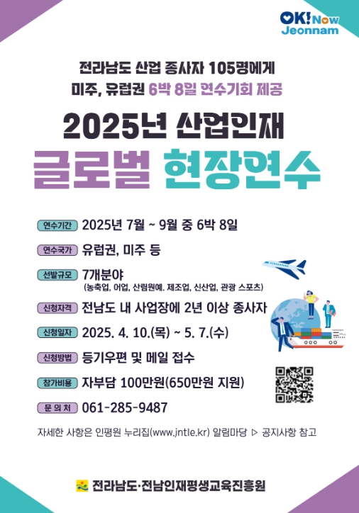 참가를 바라는 산업 종사자는 7일까지 전남인재평생교육진흥원에 등기우편이나 이메일로 신청서류를 제출해야 한다.