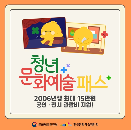 올해는 19세 청년(2006년생)을 대상으로 국비 및 지방비 포함 1인당 15만 원의 문화예술패스를 지원하고 있다. 문화예술패스는 대상자가 예매처(인터파크·예스24)를 통해 발급받고, 순수예술 분야 및 음악콘서트·페스티벌에 사용할 수 있다.