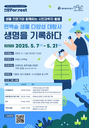 ’편백숲 생물 다양성 대탐사‘는 생물 전문가와 시민들이 함께 무등산의 생물종을 찾아 나서는 시민 과학자 활동으로, 광주전남녹색연합이 주관하여 김연경 코리아생태연구소 연구원, 박경희 전남대학교 연구원 등의 전문가가 참여한다. 초등학생과 중학생을 포함한 가족을 대상으로 총 30명을 모집한다.