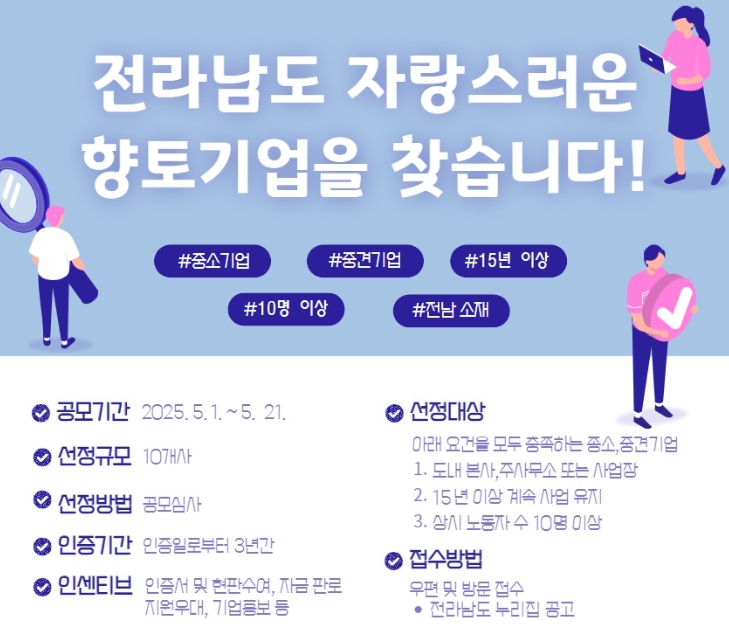 참여를 바라는 기업은 전남도 누리집 고시·공고란에서 ‘2025년 전라남도 자랑스러운 향토기업 참여기업 모집’ 공고문을 확인한 후, 신청서를 작성해 제출하면 된다.