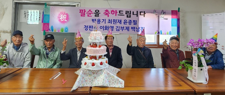 팔순을 맞은 어르신들은 각자 정성스럽게 준비한 회비로 뜻을 모았고, 신전면분회는 케이크, 수육, 과일, 꽃, 현수막 등을 마련해 훈훈한 합동 생일잔치를 완성했다.