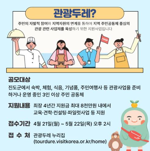 이번 모집은 진도군에 거주하는 3인 이상의 주민공동체를 대상으로 하며, 숙박, 체험, 식음, 기념품, 주민여행사 등 관광 관련 사업을 준비 중이거나 이미 운영 중인 공동체가 지원할 수 있고, 선정된 공동체에는 최대 8천만 원의 사업비가 4년간 지원된다.