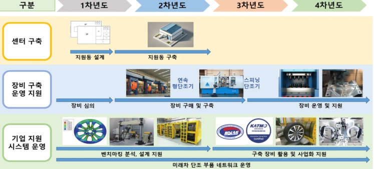 한국자동차연구원이 주관 연구개발기관으로 참여하며, 2028년까지 4년 동안 180억 원(국비 77억·지방비 103억)을 투입해 강진 성전산단 일원에 연속 형단조기와 스피닝 단조기, 시제품 제작 지원동 구축, 기업 지원 등이 진행될 예정이다.