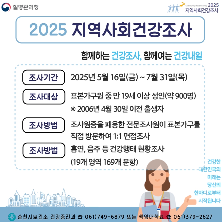 시 보건소 관계자는 “본 조사를 통해 수집된 통계자료는 순천시 보건사업의 계획 수립, 평가 등을 위해 활용되는 중요한 자료인 만큼 선정 가구는 지역 주민의 건강 향상을 위해 조사원 방문 시 조사가 원활히 진행될 수 있도록 적극적인 참여와 협조를 부탁드린다”고 말했다.