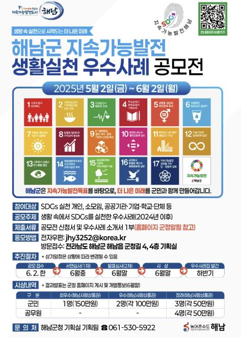 공모전은‘생활 속 실천으로 시작되는 더 나은 미래’를 주제로 ▲군민의 일상생활 속 자발적 실천 사례 ▲기관·단체·기업 등이 추진한 지속가능발전 협력 사업 사례 등 해남군의 지속가능발전목표 17개 항목 중 1개 이상과 연계된 내용이면 된다.