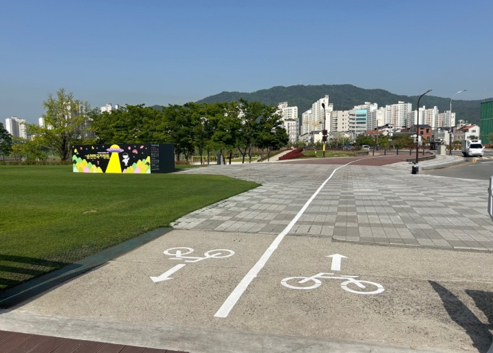 자전거 안내선도 중앙선과 마크를 선명하게 도색하여 자전거 동선을 명확히 함으로써 광장 진입으로 인한 잔디 훼손을 방지하고, 동천변 안내로 자전거 이용자와 보행자 모두 안전하고 편리하게 통행할 수 있도록 했다.