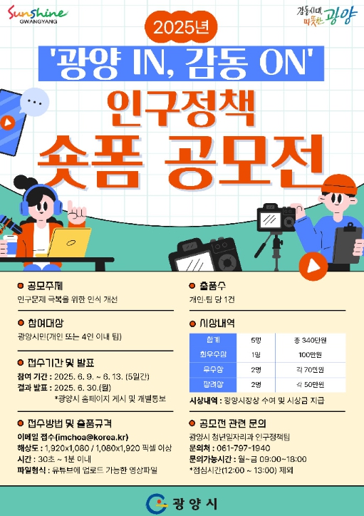 시상은 ▲최우수상 1명(상금 100만 원) ▲우수상 2명(각 70만 원) ▲장려상 2명(각 50만 원) 규모로, 오는 7월 중 열리는 인구의 날 기념행사에서 광양시장 상장과 함께 수여될 예정이다.
