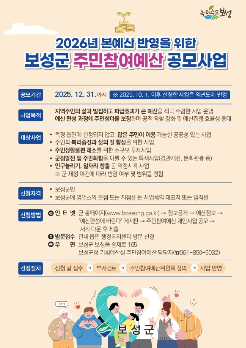 접수된 제안은 관련 부서의 타당성, 주민 수혜도 등 검토를 거친 뒤, 주민참여예산위원회 심의를 통해 최종 확정되며, 2026년도 본예산에 반영된다. 단, 2025년 10월 1일 이후 접수 건은 2027년도 예산안 편성 시 검토된다.