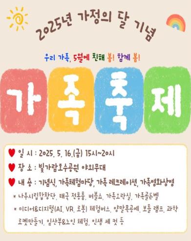 나주시가 주최하고 나주시가족센터가 주관하는 이번 행사는 ‘우리 가족, 5월에 친해 봄! 함께 봄!’을 주제로 나주시립합창단 공연, 태국 전통춤, 행복(모범)가정상 유공자 표창과 10여 개의 체험(디지털&미디어버스, 수소로켓, 양말목 카네이션, 보틀램프 등) 부스 등이 운영된다.