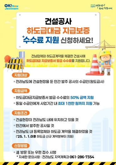 전남에서 시행되는 민간 발주 건설공사 중 지역 건설업체와 하도급 계약을 하고 지급보증서를 발급한 원도급사를 대상으로 발급 수수료의 50%(최대 1천만 원)를 지원하는 사업이다.