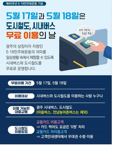 이번 무료 승차는 광주 시내버스와 도시철도에 적용되며 마을버스나 전남농어촌버스 등은 해당되지 않는다.