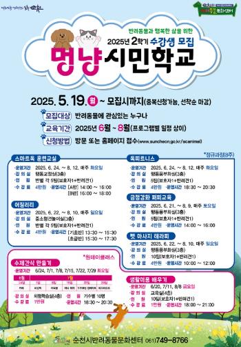 강좌 신청은 오는 19일부터 ‘순천시 반려동물문화센터 누리집’과 반려동물문화센터 방문을 통해 선착순으로 받는다.