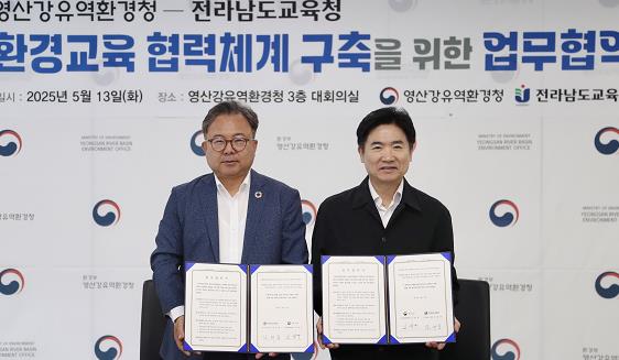 전라남도교육청과 영산강유역환경청은 13일 영산강유역환경청 대회의실에서 ‘환경교육 협력체계 구축’을 위한 업무협약을 맺고, 학생과 전문가가 함께하는 실천 중심 활동에 협력하기로 했다.