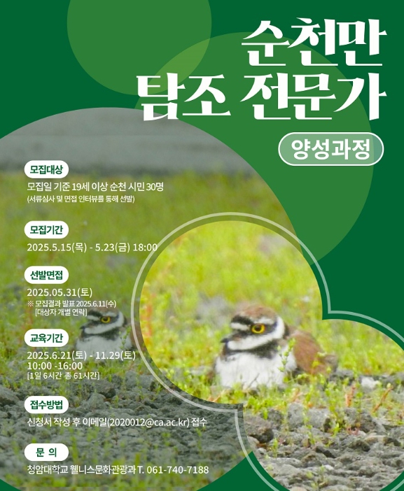 이번 교육은 유네스코 세계자연유산 순천만의 생태가치를 널리 알리고, 람사르 습지도시로 지정된 순천의 탐조관광 활성화를 위해 작년에 이어 두 번째로 운영되며 청암대학교가 주관한다.