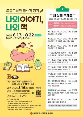 강좌 신청은 16일 오전 10시부터 광주시립도서관 누리집(citylib.gwangju.go.kr) ‘문화행사-문화강좌 신청’에서 하면 된다. 글쓰기에 관심 있는 시민이라면 누구나 신청할 수 있다. 모집 인원은 총 15명으로, 선착순 모집한다. 자세한 사항은 무등도서관으로 문의하면 된다.