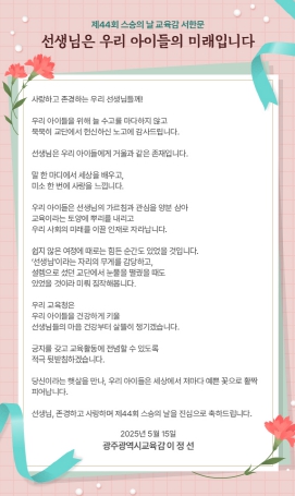 이 교육감은 이날 서한문을 통해 “선생님은 우리 아이들에게 거울과 같은 존재이다”며 “우리 아이들은 선생님의 가르침과 관심을 양분 삼아 교육이라는 토양에 뿌리를 내리고 우리 사회의 미래를 이끌 인재로 자라난다”고 밝혔다.