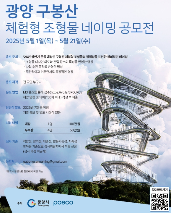 광양시와 포스코는 ‘구봉산 체험형 조형물’의 내년 상반기 준공을 앞두고 지난 5월 1일부터 전 국민의 관심 유도 및 브랜드 가치 제고를 위한 명칭 공모에 나섰다.