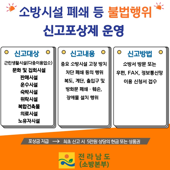 신고는 국민신문고 또는 나주소방서 누리집을 통해 접수할 수 있으며, 신고 내용이 사실로 확인되고 지급 요건을 충족할 경우, 건당 5만 원 상당의 포상금이 지급된다.