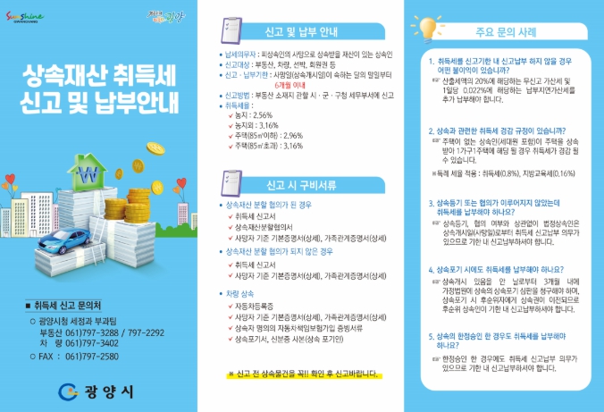이강기 광양시청 세정과장은 “시민들이 상속재산에 대한 취득세를 기한 내 정확히 신고해 불필요한 가산세를 피할 수 있도록 적극 안내하겠다”며 “앞으로도 다양한 홍보자료를 통해 납세자 불이익을 사전에 방지하고 세정 서비스의 신뢰도를 높이겠다”고 밝혔다.