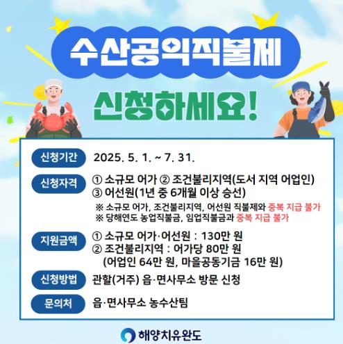수산공익직불제는 수산업·어촌의 공익 기능 증진과 어업인의 소득 안정을 도모하기 위한 제도로 ▲소규모 어가 직불제 ▲조건불리지역 직불제 2종이 있다.