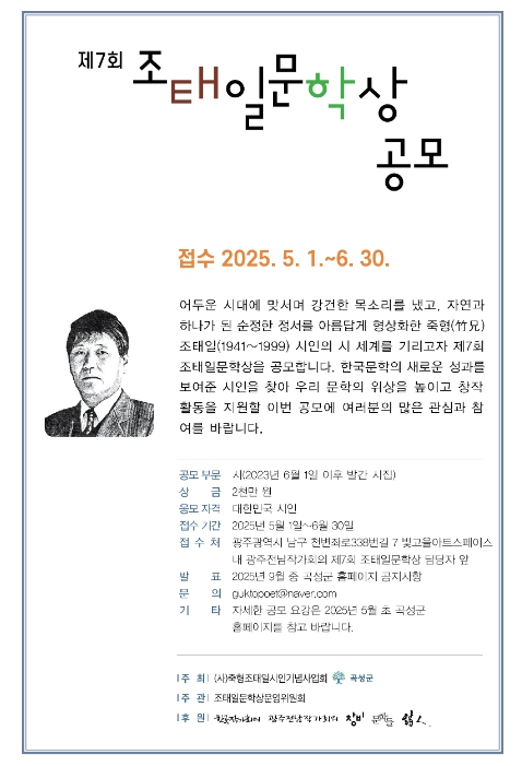 (사)죽형조태일시인기념사업회와 곡성군이 주최하고, 한국작가회의, 광주전남작가회의, 창비, 문학들이 후원하는 '제7회 조태일문학상' 접수 기간은 5월 1일부터 6월 30일까지 2개월간이며, 최근 2년 이내(2023년 6월 1일 이후)에 발간한 시집을 시인 본인이 등기우편으로 제출하거나 추천위원의 추천을 통해 응모할 수 있다.