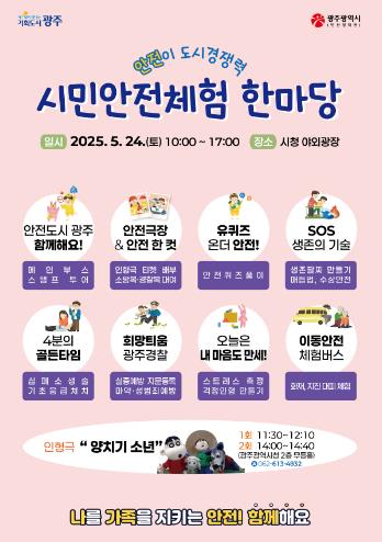 안전체험 한마당에는 ▲유퀴즈 온 더 안전(안전퀴즈풀이) ▲4분의 골든타임(심폐소생술 및 기초응급처치 배우기) ▲SOS 생존의 기술(구조구난 매듭법, 수상안전, 생존팔찌 만들기) ▲이동안전체험버스(화재·지진 대피체험) ▲오늘은 내 마음도 만세!(스트레스 측정, 걱정인형 만들기, OX퀴즈) ▲희망틔움 광주경찰(실종예방지문등록, 마약·성범죄 예방활동) 등 안전교육과 체험행사가 다양하게 마련된다.