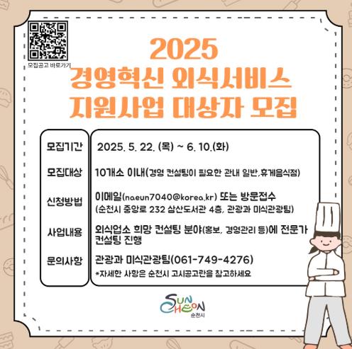 지원을 희망하는 외식업소는 내달 10일까지 순천시청 고시공고문에 게재된 사업 신청서와 관련 서류를 담당자 이메일 또는 순천시 관광과 미식관광팀으로 방문 접수하면 된다.
