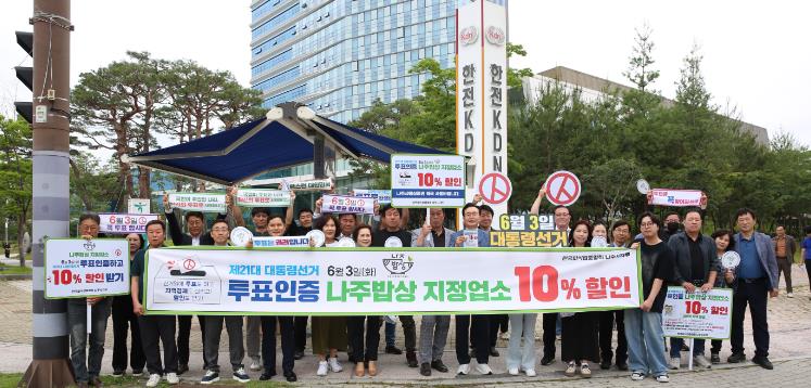윤병태 나주시장과 한국외식업중앙회 나주시지부, 빛가람혁신도시 상가번영회 회원 60여명은 23일 오전에 한전KDN 사거리에서 유권자의 소중한 한 표 행사를 독려하는 거리홍보 캠페인을 진행했다.
