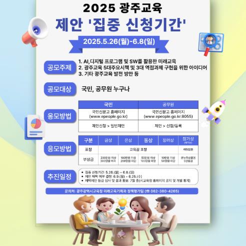 공모 주제는 ▲AI‧디지털 프로그램 및 소프트웨어(SW)를 활용한 미래교육 방안 ▲광주교육 5대 주요시책(다양성교육, 책임교육, 공정교육, 미래교육, 상생교육) 및 3대 역점과제(다양성을 품은 실력향상, 미래로 가는 AI교육, 모두가 동행하는 시민협치) 구현을 위한 아이디어 ▲기타 광주교육 발전 방안 등 3개다.