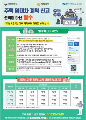 전남도 관계자는 “주택 임대차 계약 신고제는 건전한 임대차 문화를 조성하고 임차인의 권리를 사전에 보호하기 위한 제도”라며 “신고 의무 위반에 따른 과태료 등 불이익이 발생하지 않도록 계약 시 지체없이 신고하길 바란다”고 말했다.