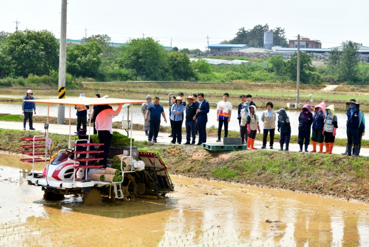 이어진 종자관리소에서 한 달여 동안 정성을 들여 가꾼 새청무 벼 육묘판을 인근 들녘으로 옮기고, 이앙기에 실은 후 한 해 농사의 시작을 알리는 모내기 순으로 진행했다.