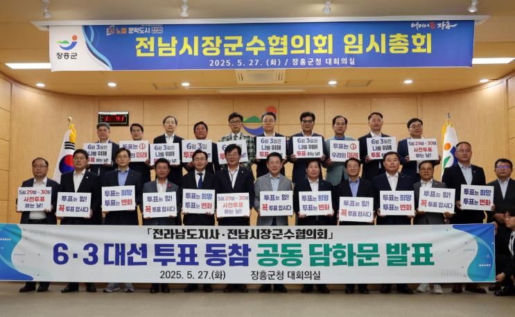 협의회장 김성 장흥군수는 “투표는 단순한 행위가 아닌 대한민국의 미래를 결정하는 가장 강력한 방법”이라며, “우리나라 민주주의의 가치를 수호하기 위해 전남도민 여러분께서 소중한 한 표를 행사해 주시기를 바란다” 라고 밝혔다.