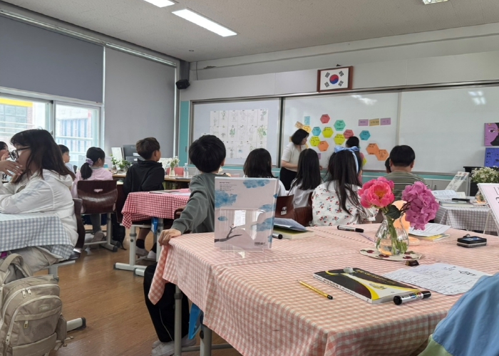 이번 수업은 ‘책 시식회’를 통해 학생들이 직접 고른 책을 다양한 방식으로 맛보듯 탐색하며 기대되는 책을 선정하는 활동으로 구성됐다. 교실 곳곳에 펼쳐진 학급 문고 책들을 자유롭게 돌아다니며 표지, 띠지, 작가 소개, 친구의 추천서 등을 살펴보고, 처음 몇 장을 직접 읽어보며 책과의 거리를 좁히는 시간을 가졌다. 아이들은 자신이 고른 책에 대한 첫인상을 메뉴판에 기록하고, 마지막에는 가장 기대되는 책에 투표하며 그 이유를 함께 나눴다.